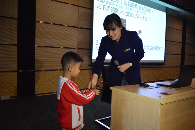 参观完展厅后同学们来到我馆一楼多功能厅参与小课堂《铜鼓的故事》,课堂上工作人员首先普及了铜鼓的相关知识,“铜鼓有什么类型的?”、“铜鼓的纹饰有什么特征呢?”,一系列的问答让小课堂气氛十分活跃,同学们纷纷抢答,回答正确的同学还获得了精美的小礼品。
