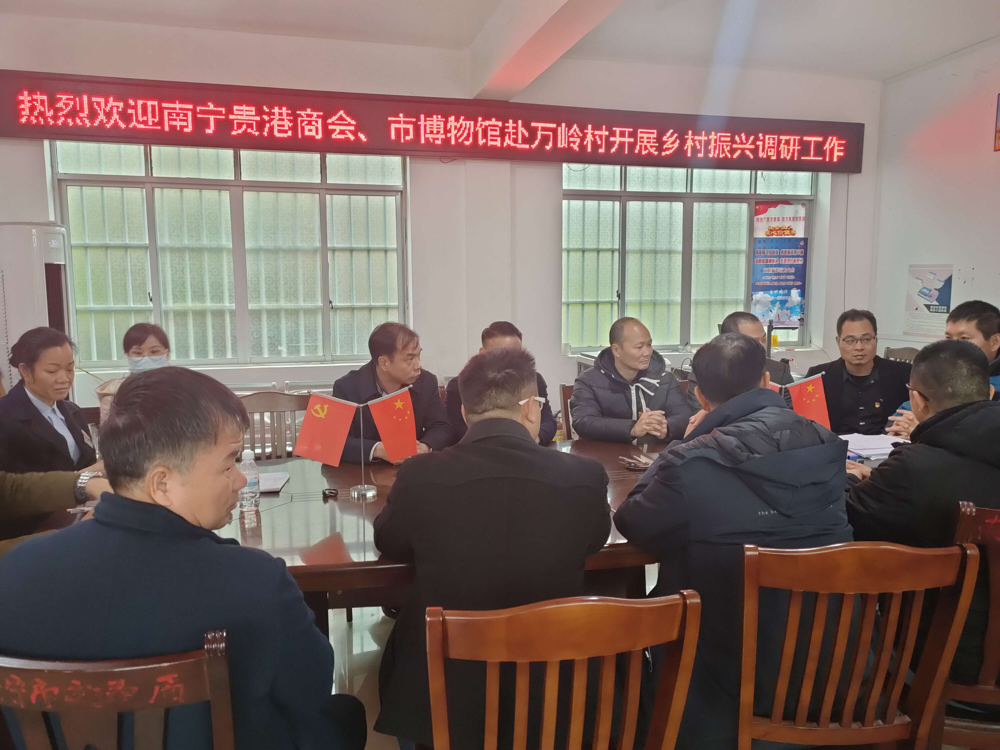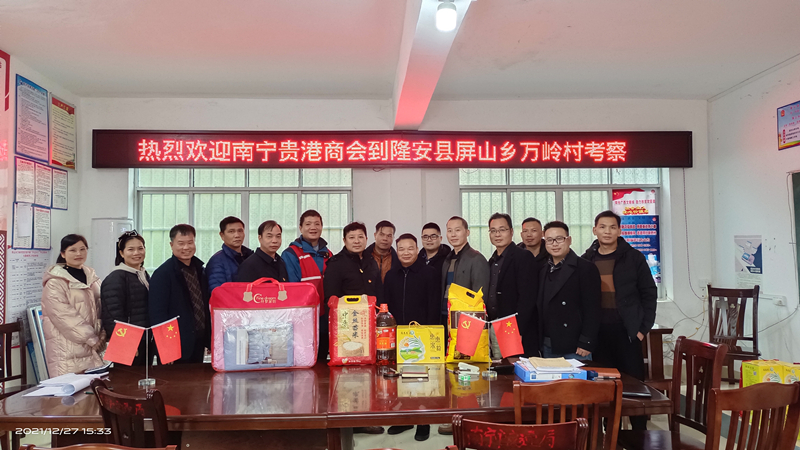 2021年12月27日,南宁市博物馆联合南宁贵港商会、广西金壮锦文化投资有限公司、广西印象物业服务有限责任公司等赴隆安县屏山乡万岭村开展调研慰问工作,与万岭村第一书记、村两委就乡村振兴工作进行座谈,调研万岭村巩固脱贫攻坚成效及家庭产业发展情况,亲切慰问驻村第一书记和困难群众。
