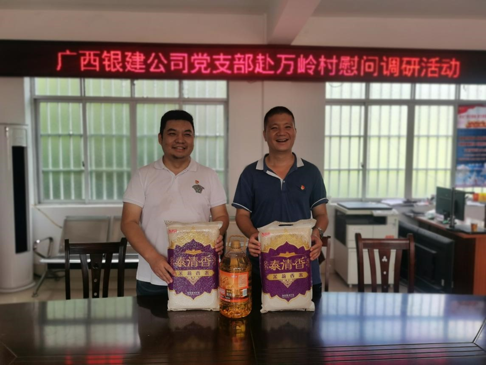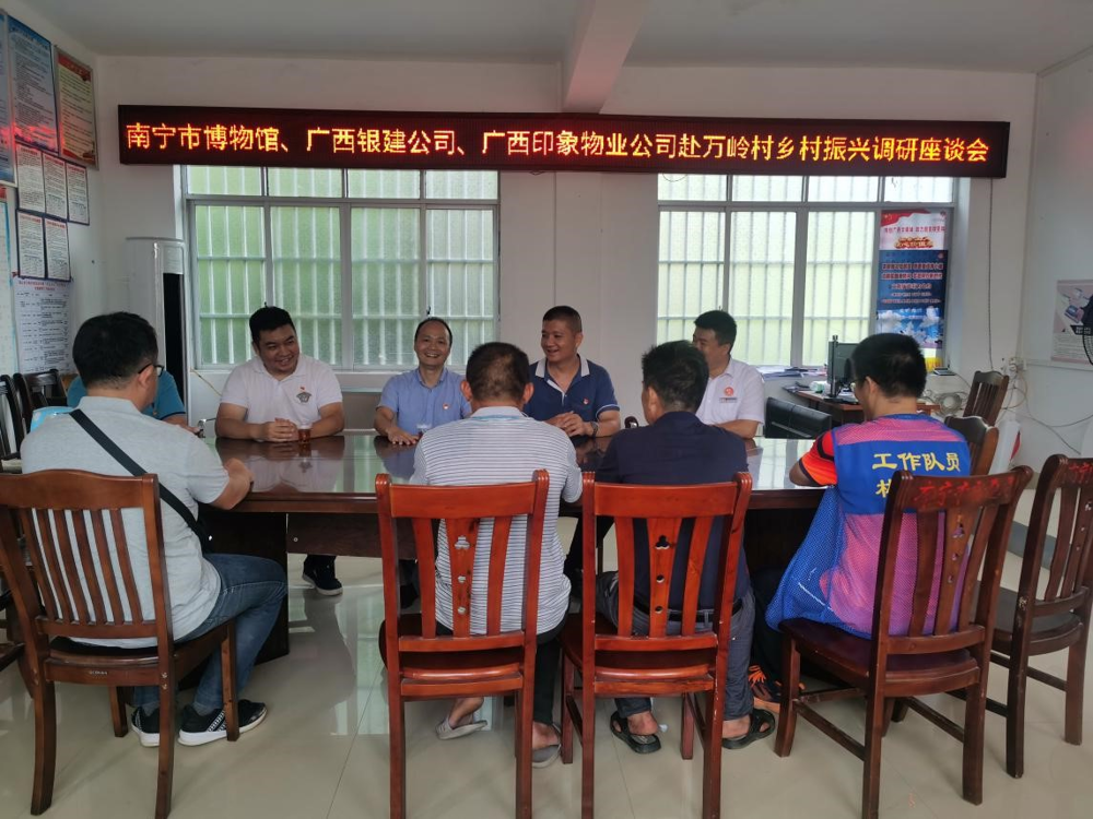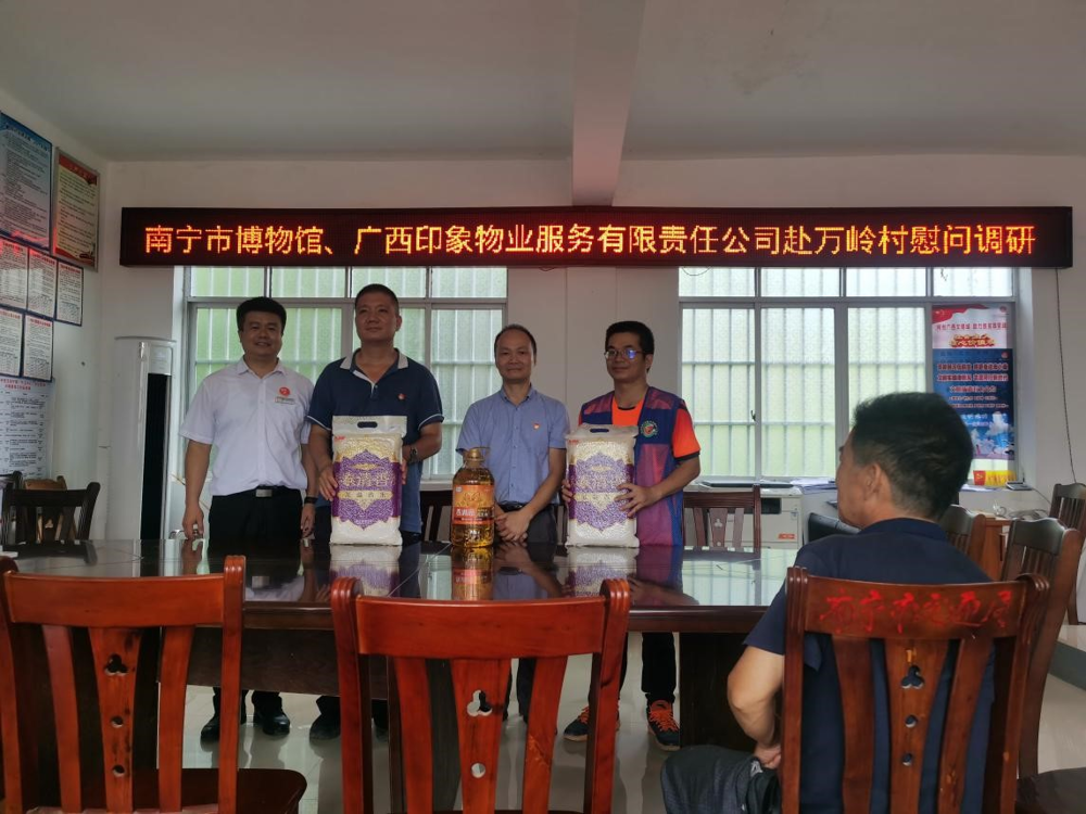 2021年7月29日,南宁市博物馆卢敏生副馆长、广西银建公司党支部陆畅欣书记、广西印象物业有限责任公司代表王嘉经理等人赴隆安县屏山乡万岭村开展乡村振兴调研慰问工作,与我馆派驻万岭村第一书记、驻村工作队员、村两委就乡村振兴工作进行座谈,调研万岭村产业发展状况,走访慰问困难群众。