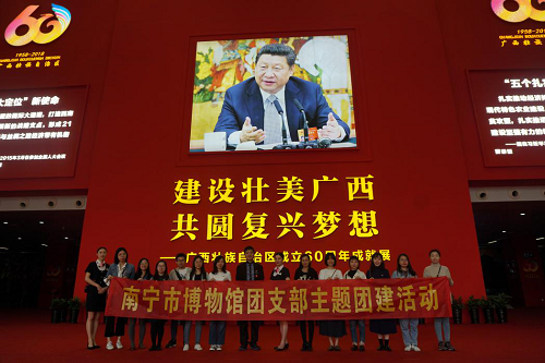 我馆团员青年首先参观了广西规划馆的“建设壮美广西 共圆复兴梦想--广西壮族自治区成立60周年成就展”,通过实物、图片了解了广西的壮美河山及60年来经济、文化、交通基础设施、医疗等方面取得的重大成就,并亲身体验了AR等先进的陈展方式。