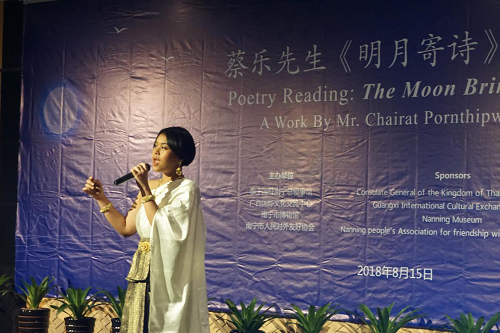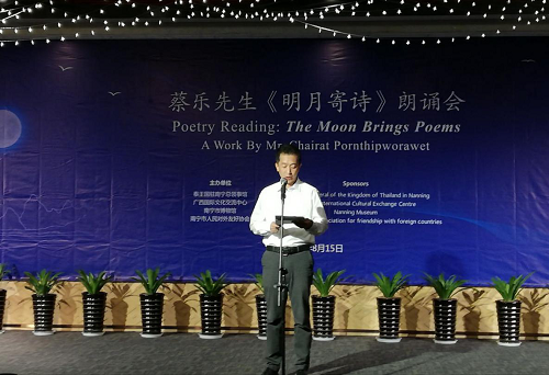 “原野芳菲春季生,相残风雨总不容。冬至匆匆去青木,苍劲依旧仍古松。”8月15日,在南宁博物馆举办的《明月寄诗》朗诵会上,泰王国驻南宁总领事馆总领事蔡乐·蓬蒂窝拉卫朗诵了自己创作的中国古体诗《古松赞》,以此表达对泰中两国人民友好情谊万古长青的期许。