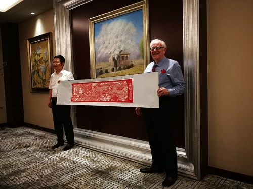 马克林教授在延安的行程,得到了广西国际文化交流中心、延安枣园国宾馆、海南博鳌国宾馆的精心安排,中国画院蔡葵老师赠送了马克林教授画像。延安市委市政府高度重视,刘晓军副市长与马克林教授进行了会见,并向他赠送了毛主席像章和“清明上河图”剪纸两件礼物。