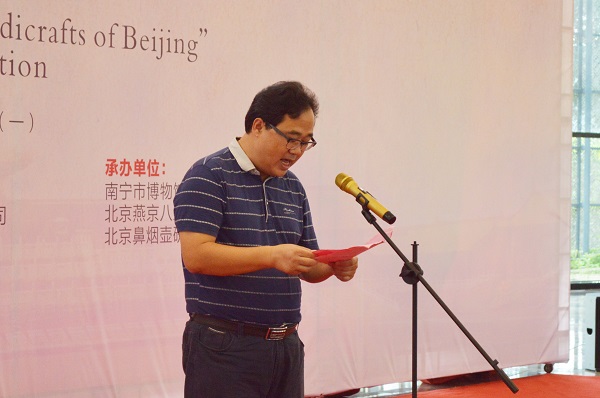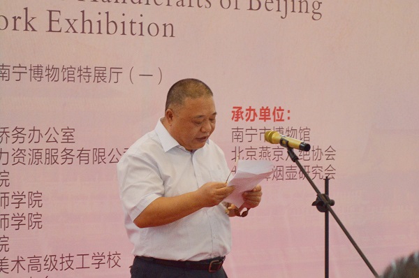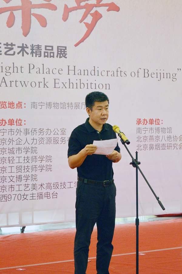 北京市政协委员、北京国际人才交流协会会长、北京市人力资源和社会保障局原党组书记、局长张欣庆、南宁市文化新闻出版广电局副局长李华汉以及北京市工艺美术大师代表张铁成在开展仪式上分别致辞,全国政协委员、国家人力资源和社会保障部原党组副书记、副部长杨志明宣布正式开展。