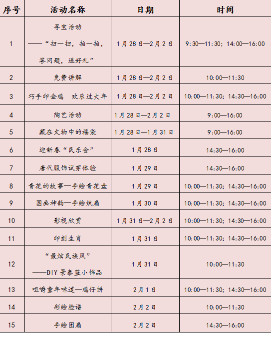 2017年1月28日——2月2日(即大年初一至初六),我馆将围绕“金鸡报晓普天同欢庆 春华秋实南博满周岁”这一主题开展春节系列文化活动,包括“寻宝活动”、定时免费讲解、影视欣赏、“巧手印金鸡 欢乐过大年”、陶艺活动藏在文物中的福袋等常设活动;手绘青花盘、手绘纨扇、咀嚼童年味道——鸡仔饼DIY、彩绘脸谱、印刻生肖、手绘团扇等亲子活动。