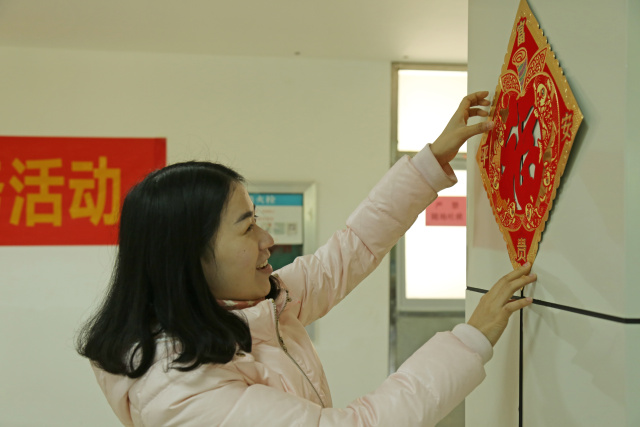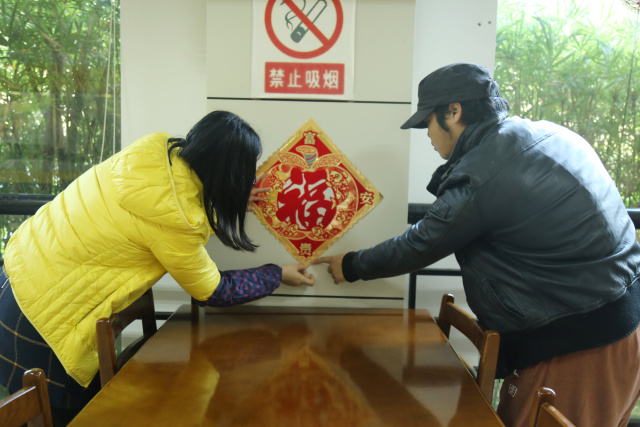 为了给老人们带去惊喜,我馆工作人员一早来到养老服务中心的食堂,商讨着如何张贴装点来增添食堂的节庆氛围。在有说有笑中,工作人员将一个个小灯笼展开并粘贴好,并将它们串起来悬挂在柱子上;美丽的窗花贴在侧边的透明玻璃上,让人拥有回家团圆般的喜庆和温暖;福字贴在老人进入食堂走道的立柱上,寓意“福到”。
