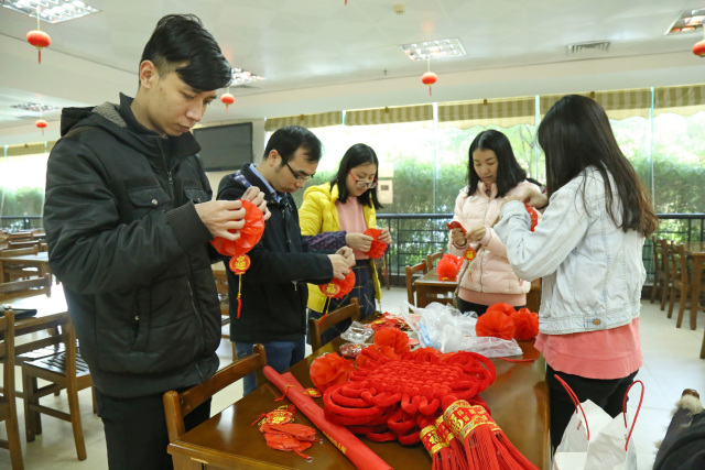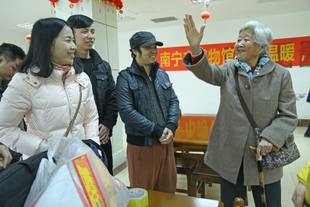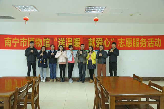 2017年1月23日上午,伴着冬日早晨暖暖的阳光,南宁市博物馆的志愿服务小分队提着灯笼、窗花、福字、中国结等寓意着红红火火、吉祥如意的年货来到广西医大仁爱养老服务中心,为老人们装点食堂,给他们带去冬日的温暖和节日的喜庆。