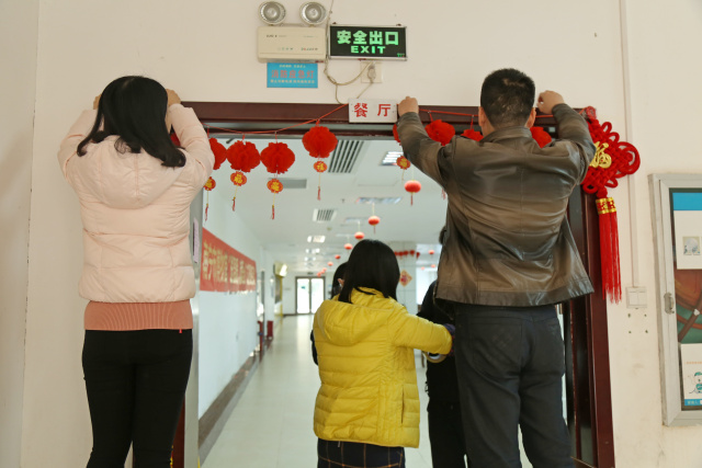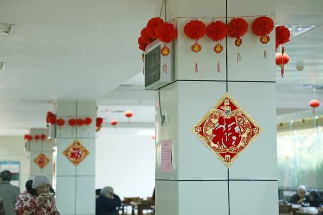 中国结挂在大门两端,烘托中国传统春节喜庆的氛围。到了吃饭时间,爷爷奶奶们看见被装扮得红彤彤的食堂笑颜顿开。同时,工作人员一起向走进食堂的爷爷奶奶们送上新春的祝福,祝愿他们在新的一年里身体健康,万事如意。