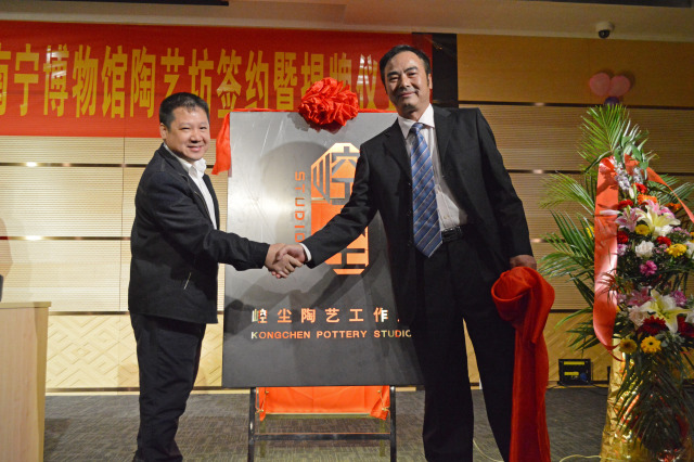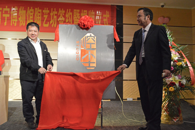 南宁市博物馆副馆长卢敏生致欢迎词 南宁市崆尘空间艺术设计室负责人魏振荣老师代表讲话 签约暨揭牌仪式上,双方共同签订了《南宁市博物馆与关于南宁市博物馆陶艺坊陶艺文化建设项目合作协议》。 南宁市博物馆馆长张晓剑与魏振荣老师共同签订项目合作协议 南宁市博物馆党支部书记黄胜敏与魏振荣老师共同揭牌 签约暨揭牌仪式结束后,南宁市崆尘空间艺术设计室与南宁市博物馆相关工作人员到陶艺坊参观工作室。 陶艺坊 南宁市博物馆首次引进工艺美术工作室,是为了缩短传统文化与现实生活之间的距离,引导观众在娱乐中学习到馆藏文化知识,更好的发挥博物馆的社会教育职能。 为了扩大南宁市优秀文化创意产品的知名度,从而更好地实现社会效益与经济效益,今后南宁市博物馆还会陆续引进更多的文化创意类型的企业单位及工艺大师。 ◆ ◆ ◆ ◆ (文/邓玲 图/梁翔宇)
