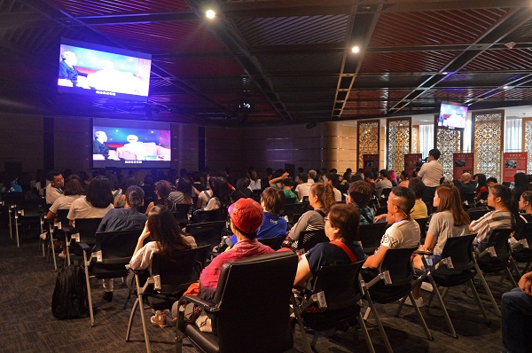参观完展览,大家来到一楼多功能厅参加了红线女的电影艺术片《永恒的舞台》首映礼。《永恒的舞台》是红线女与儿子马鼎盛共同完成的专题片。这既是红线女一生最后的一部纪录片,也是她们母子的首次合作。纪录片以访谈的方式展现了红线女不平凡的艺术人生,许多鲜为人知的故事也在其中首次披露。“红线牵古今,痴情写春秋。我愿随大江东去,一碧万里,淘尽千古愁。”画面最后定格在红线女翩然谢幕的身影上。灯光亮起,掌声雷鸣,台下不少观众却早已潸然泪下。