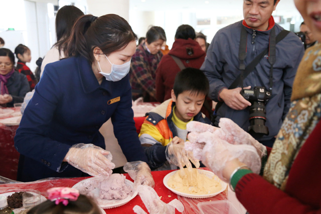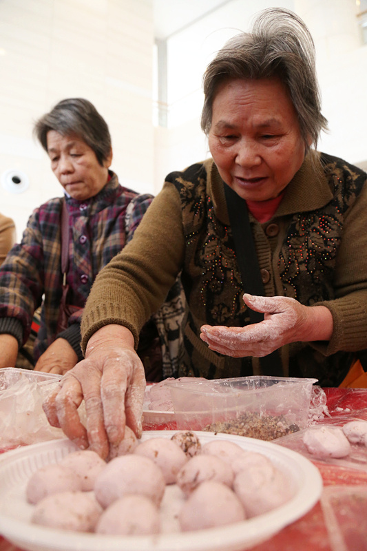 在包汤圆过程中,观众们还自发相互帮助,以老带幼,将包汤圆的技艺一代代地传承。