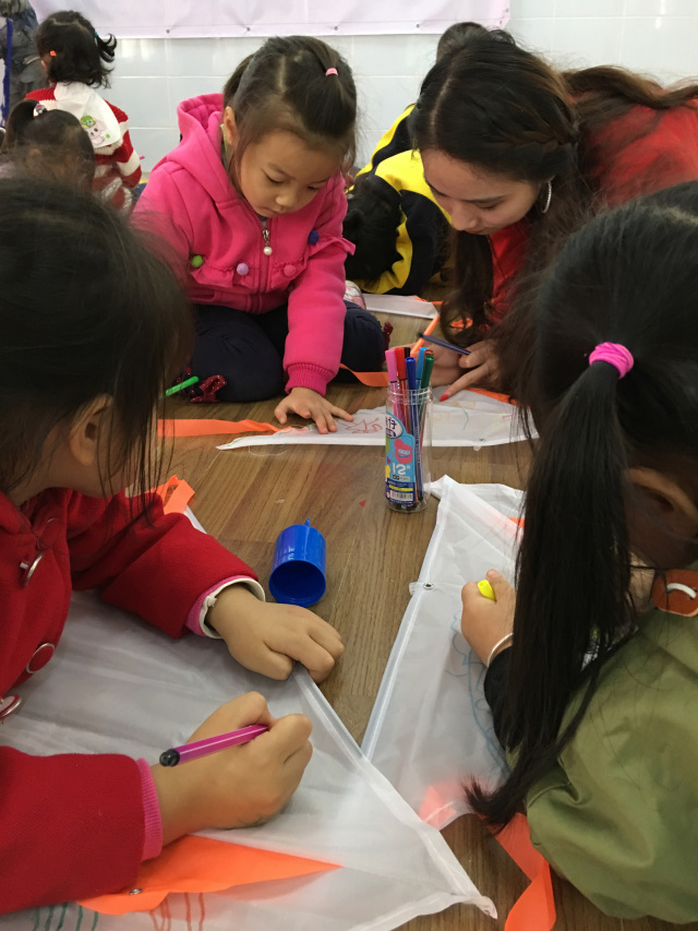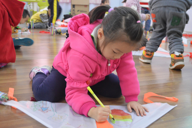 “DIY风筝”活动环节中小朋友们发挥想象在空白无图案的风筝上进行绘制