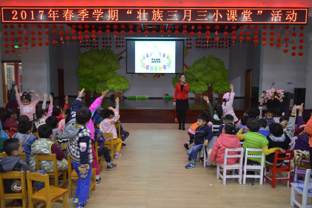 2017年3月20日上午,《我心中的“三月三”》小课堂活动在东方国际幼儿园开展,南宁博物馆讲解员采用幻灯片的讲课方式向小朋友们讲述了“三月三”习俗,并在课堂上提问,“三月三为什么要画彩蛋呢?”、“绣球的形状特征是什么样的?”、“糯米饭有几种颜色呀?”,小朋友们都很认真地听课,回答问题的时候小朋友们都纷纷举手抢答,答对的小朋友还获得了我馆送出的小礼物,别提多开心了。