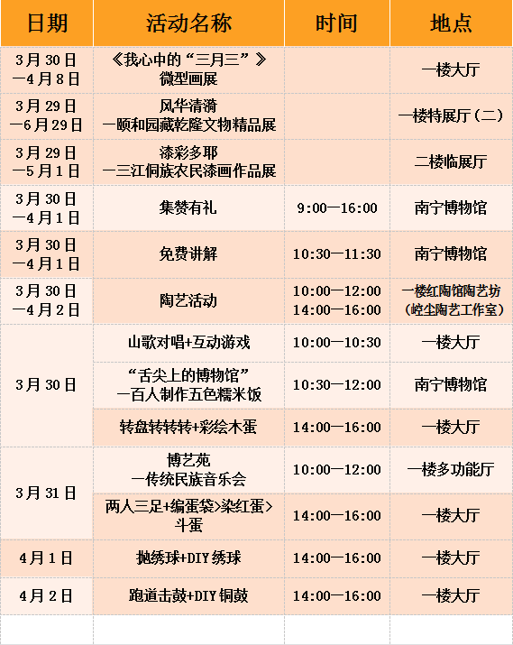 届时欢迎大家前来参观与参与“三月三”、清明期间有趣的系列活动。(活动一览表见下表)