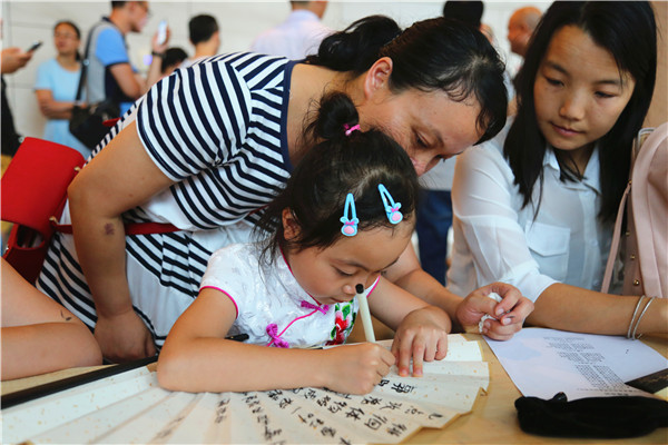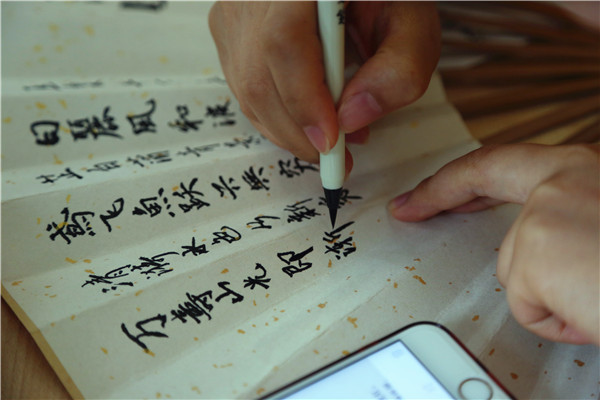 活动一开始,就吸引了不少观众。他们在老师的指导下选择了自己喜爱的乾隆诗,并且反复在稿纸上练习,直到满意后才将诗题在折扇上。