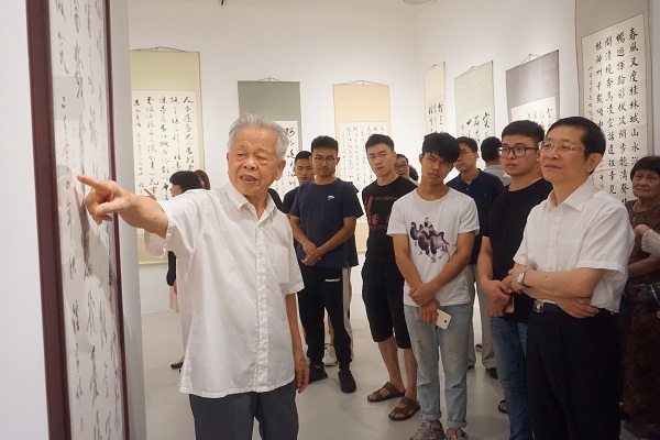 开展当天,嘉宾们首先在南宁博物馆二楼书画展厅门口合影,随后进入到展厅进行参观,钟家佐先生在现场亲自为各位来宾解说。
