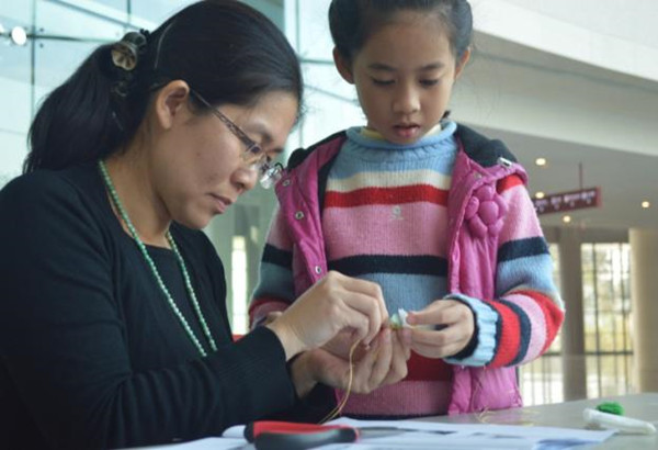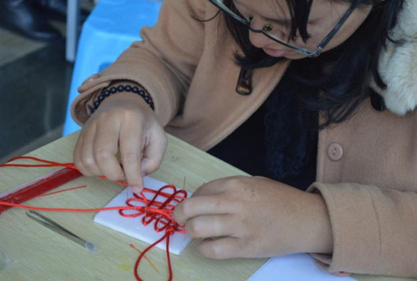 工作人员在指导市民做玉佩挂绳