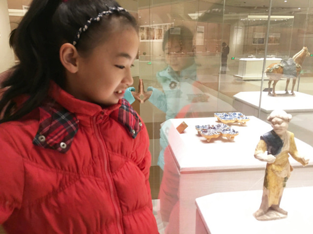 在绘制帆布包之前我馆工作人员带领参加活动的观众进入“泥火幻彩—唐都长安三彩精华展”展厅参观,观众将喜爱的唐三彩单品拍照后再移步到绘画区域进行帆布包的绘制。