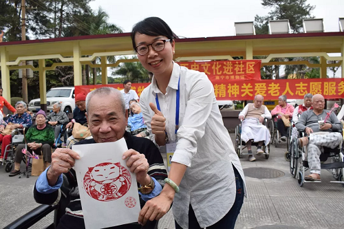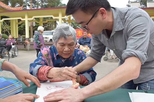 下午三点,活动开始,现场工作人员首先为老人们分发了慰问品、鲜花,之后又引导老人们前来体验油印版画,通过涂、贴、印、揭等步骤,一幅幅可爱的福娃就出现在了大家的面前。