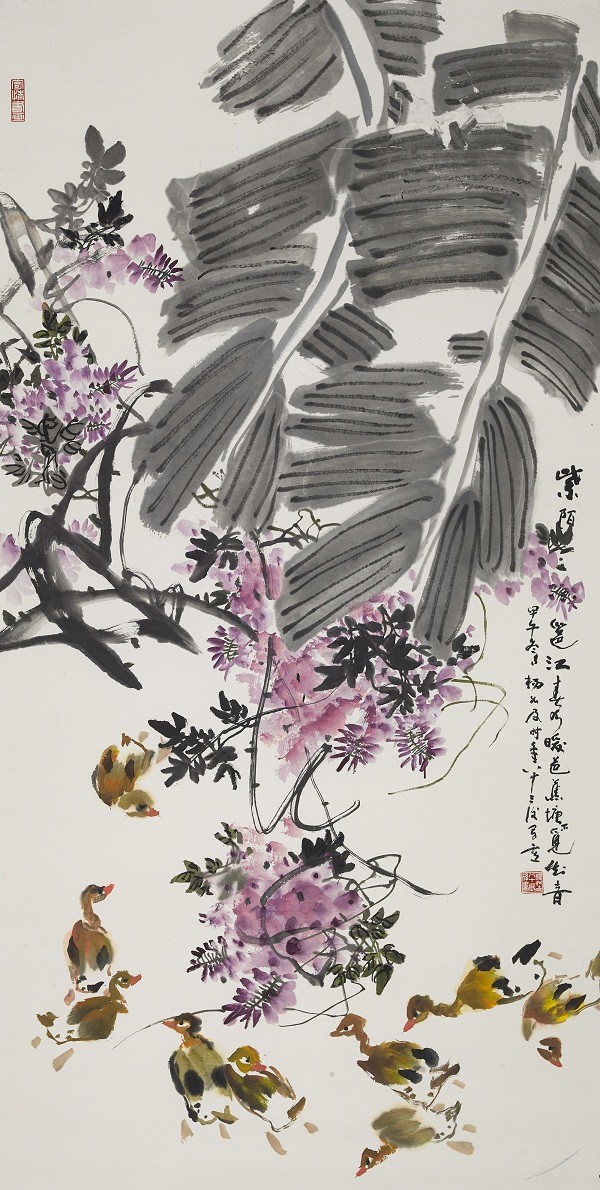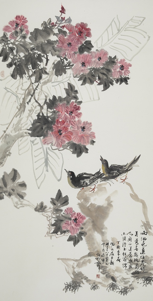“雨洒芭蕉任卷舒,芙蓉喜鹊玩潇疏。人间正道苍桑换,不读诗书枉冠儒。”这是出自杨如及国画作品《雨洒芭蕉任卷舒》中的题画诗。画中有诗,诗中有画,是对画家的一种苛求,也是中国画博大精深之所在。“人无我有,人有我优。”这是杨如及孜孜不倦地追求诗、书、画“三绝”信条。杨如及先生,融岭南、海派传统笔墨,融诗书画于一炉,读来让人感受到一种文人的风雅,像一缕幽香,萦绕着田园旷野,带来袅袅余音。